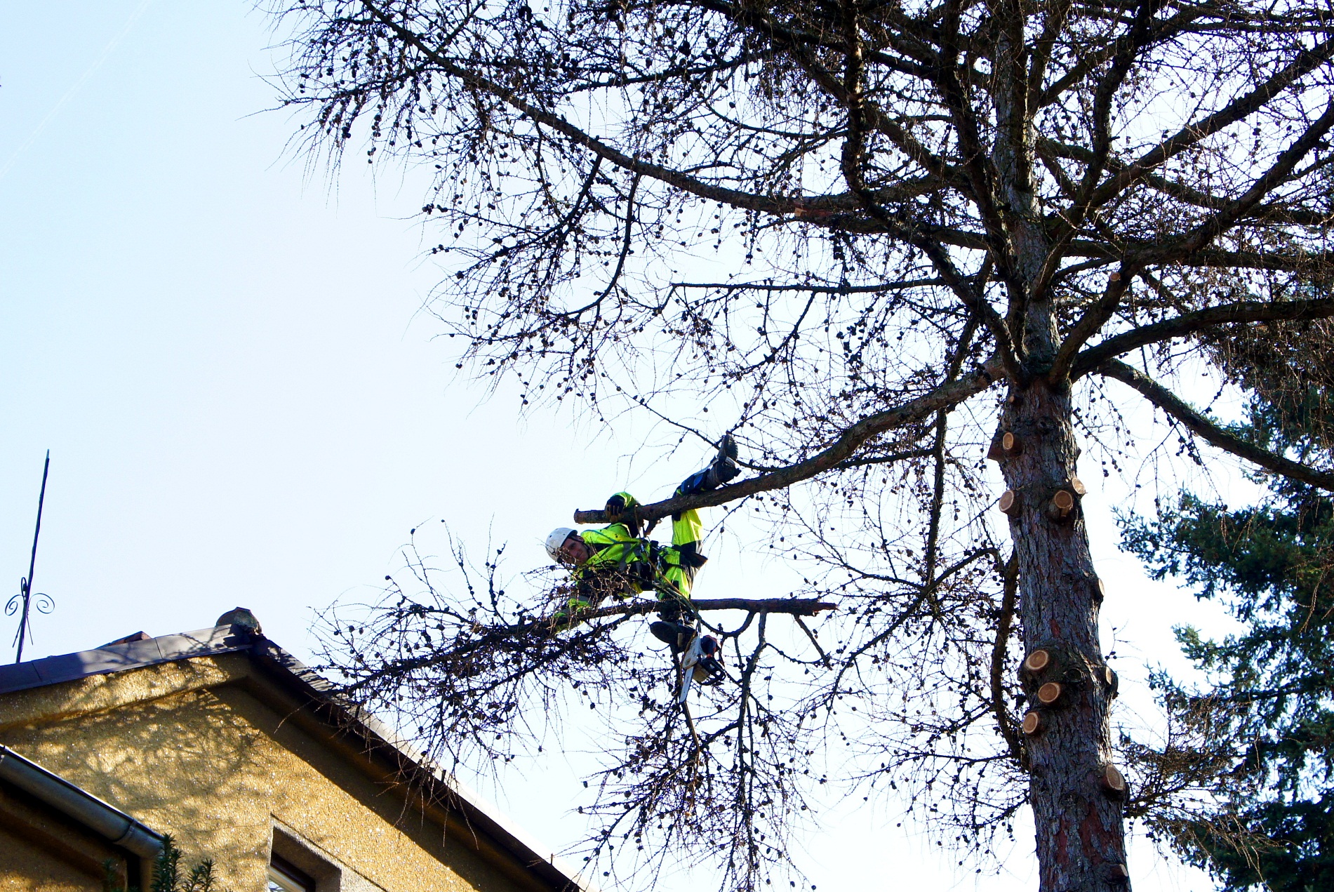 Kácíme postupným seřezáváním stromu od koruny dolů, větve se spouští na lanech do přesně vymezeného prostoru, aby nedošlo k poškození okolního majetku. Disponujeme vybavením, se kterým jsme schopni pohybu v korunách stromů i v těch nejnáročnějších podmínkách.